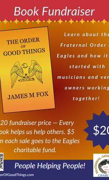 I'm excited to announce my new book is here and we are going to celebrate at the Folsom Eagles Open Mic night at 6pm March 11th. Stop by and pick up a copy at our fundraising price of $20. Learn about the Fraternal Order of Eagles and how it all started with musicians and venue owners working together! People Helping People is their motto. Stay for the music and join the fun!
